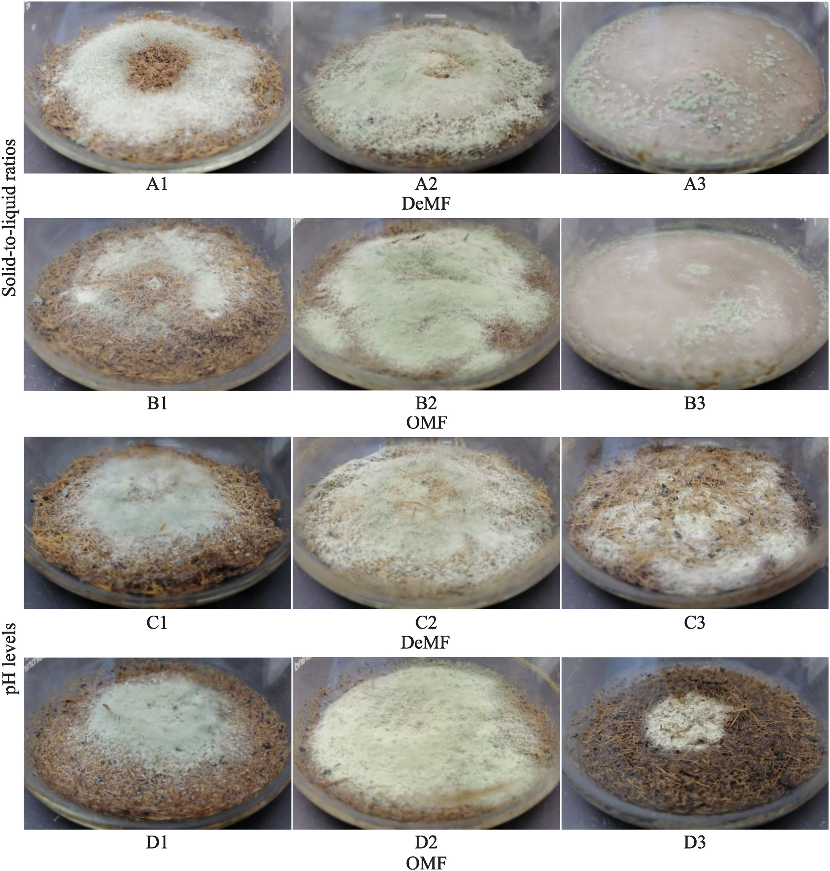 Fig 2: Macroscopic visualization of fungal biomass across different SLR and pH levels. A1-3: Fungal biomass variation across different SLRs using DeMF hydrated with distilled water. B1-3: Fungal biomass variation across different SLRs using OMF hydrated with distilled water. C1-3: Fungal biomass variation across different initial pH levels using DeMF hydrated with McIlvaine buffer. D1-3: Fungal biomass variation across different initial pH levels using OMF hydrated with McIlvaine buffer. |