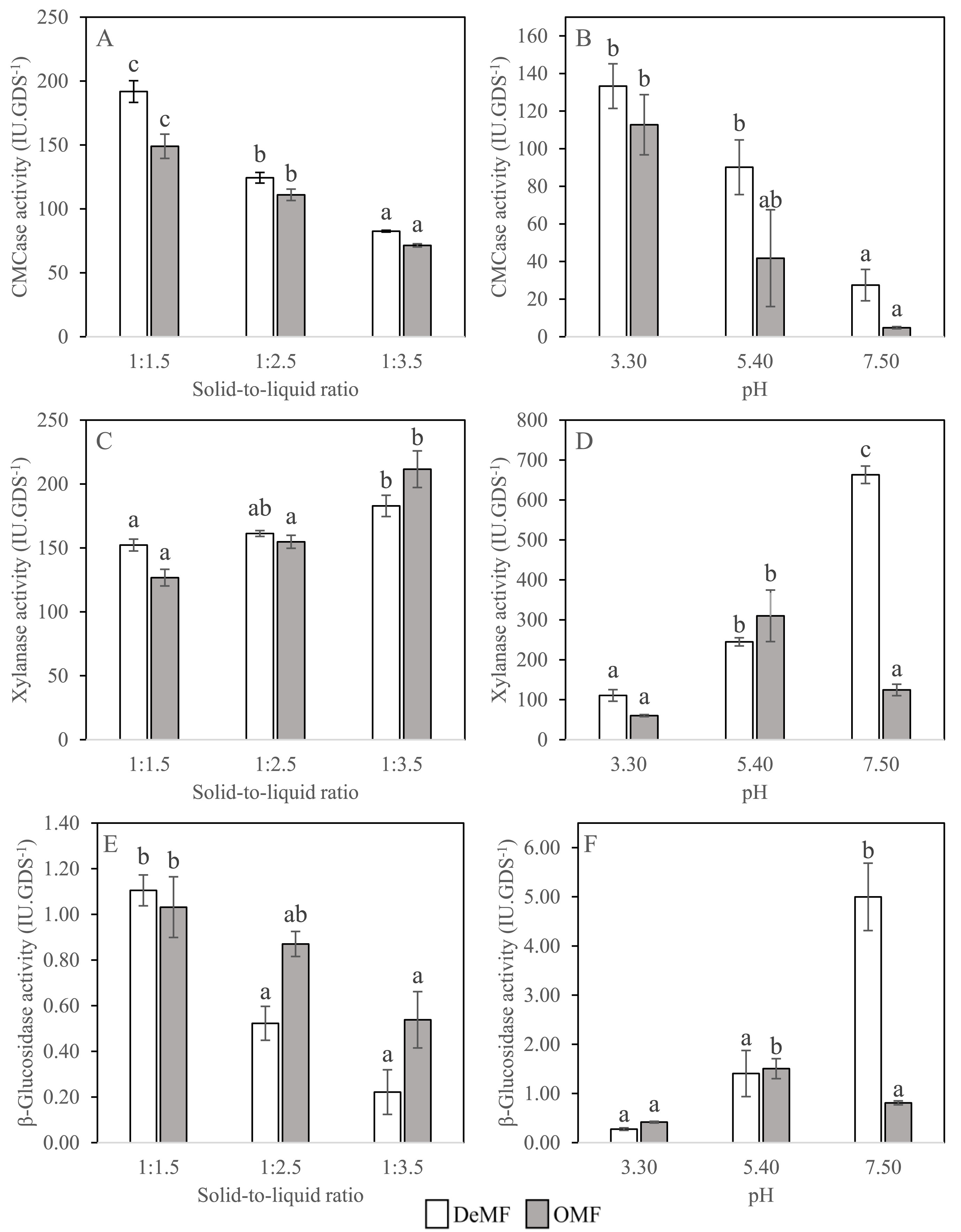 Fig 3. Activities of (hemi)cellulolytic enzymes across varying SLRs and pH levels using DeMF and OMF as solid matrices. A: CMCase activity at different SLRs using distilled water as a hydration medium. B: CMCase activity at different pH levels using McIlvaine buffer as a hydration medium. C: Xylanase activity at different SLRs using distilled water as a hydration medium. D: Xylanase activity at different pH levels using McIlvaine buffer as a hydration medium. E: β-Glucosidase activity at different SLRs using distilled water as a hydration medium. F: β-Glucosidase activity at different pH levels using McIlvaine buffer as a hydration medium