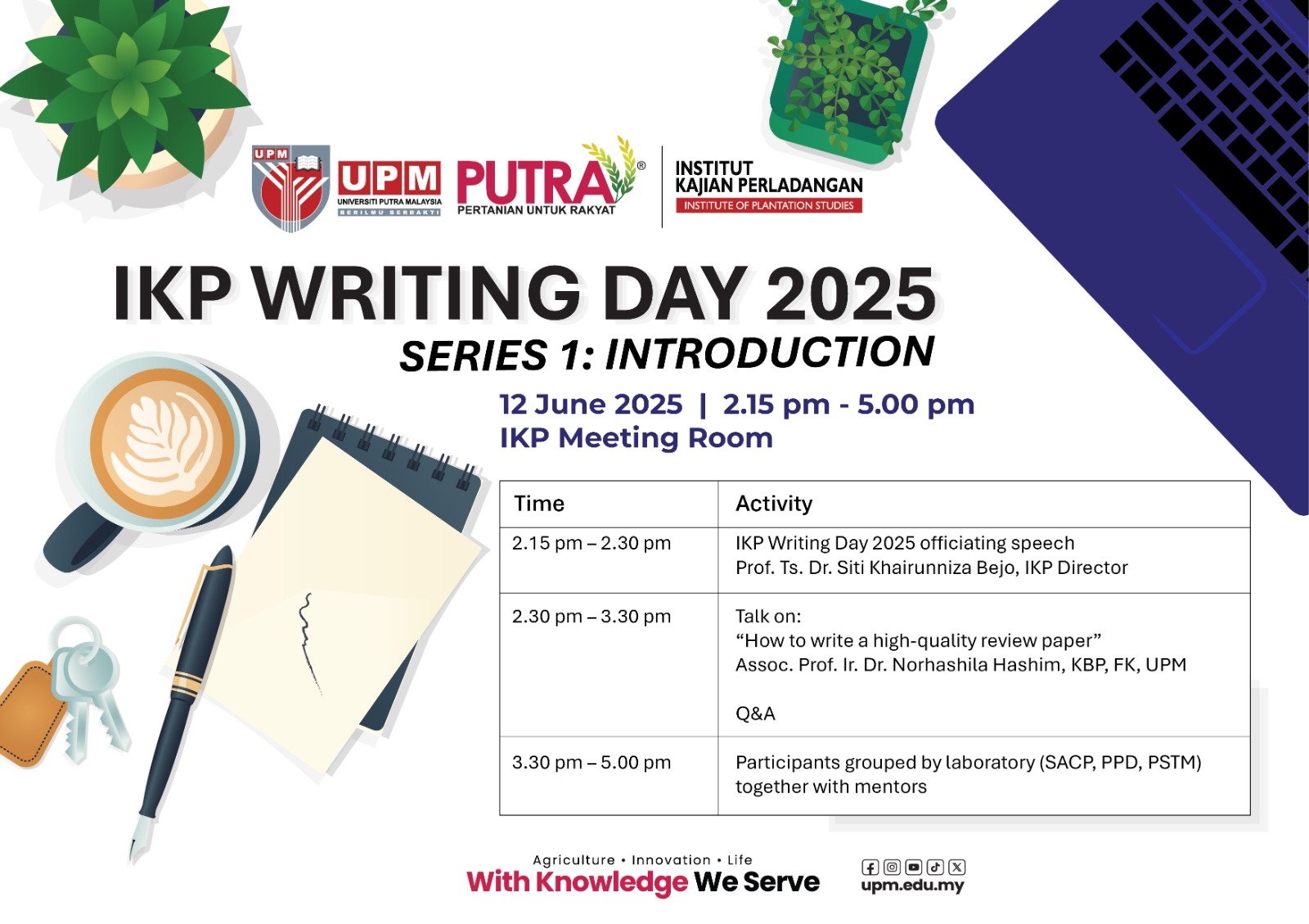 SERDANG, 12 Jun — Institut Kajian Perladangan (IKP) telah menganjurkan program IKP Writing Day 2025 – Siri 1 pada 12 Jun 2025 bertempat di Bilik Mesyuarat IKP. Program ini disertai oleh seramai 17 pelajar siswazah yang bersemangat untuk mempertingkat kemahiran penulisan akademik mereka.