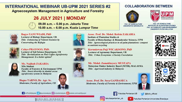 International Webinar UB-UPM 2021 Series #2 telah diadakan pada 26 Julai 2021. Webinar ini telah dianjurkan oleh Fakulti Pertanian, Universitas Brawijaya dan Fakulti Pertanian, Universiti Putra Malaysia dengan Kerjasama Institut Kajian Perladangan (IKP) dan Fakulti Perhutanan dan Alam Sekitar, UPM. Webinar telah dihadiri oleh 200 peserta daripada pelbagai universiti dan organisasi daripada kedua negara, Malaysia dan Indonesia.