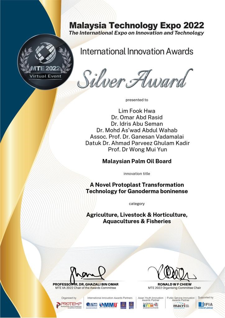 21-25 Mei - Dua orang penyelidik daripada Laboratori Agronomi dan Perlindungan Tanaman Lestari, Institut Kajian Perladangan (IKP), iaitu Prof. Dr. Wong Mui Yun dan Prof. Madya Dr. Ganesan Vadamalai telah berjaya memenangi pingat perak dalam pertandingan inovasi antarabangsa, Malaysia Technology Expo 2022 (MTE 2022) dengan inovasi bertajuk “A Novel Protoplast Transformation Technology for Ganoderm boninense”. Ekspo ini telah diadakan secara maya bermula pada 21 sehingga 25 Mei 2022.