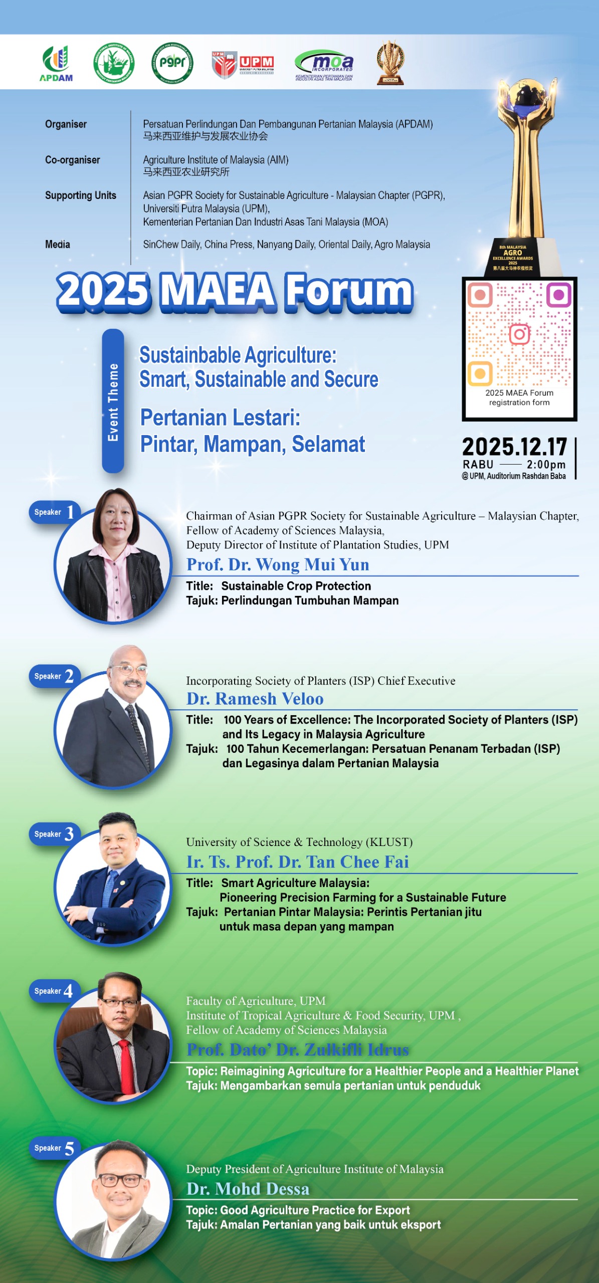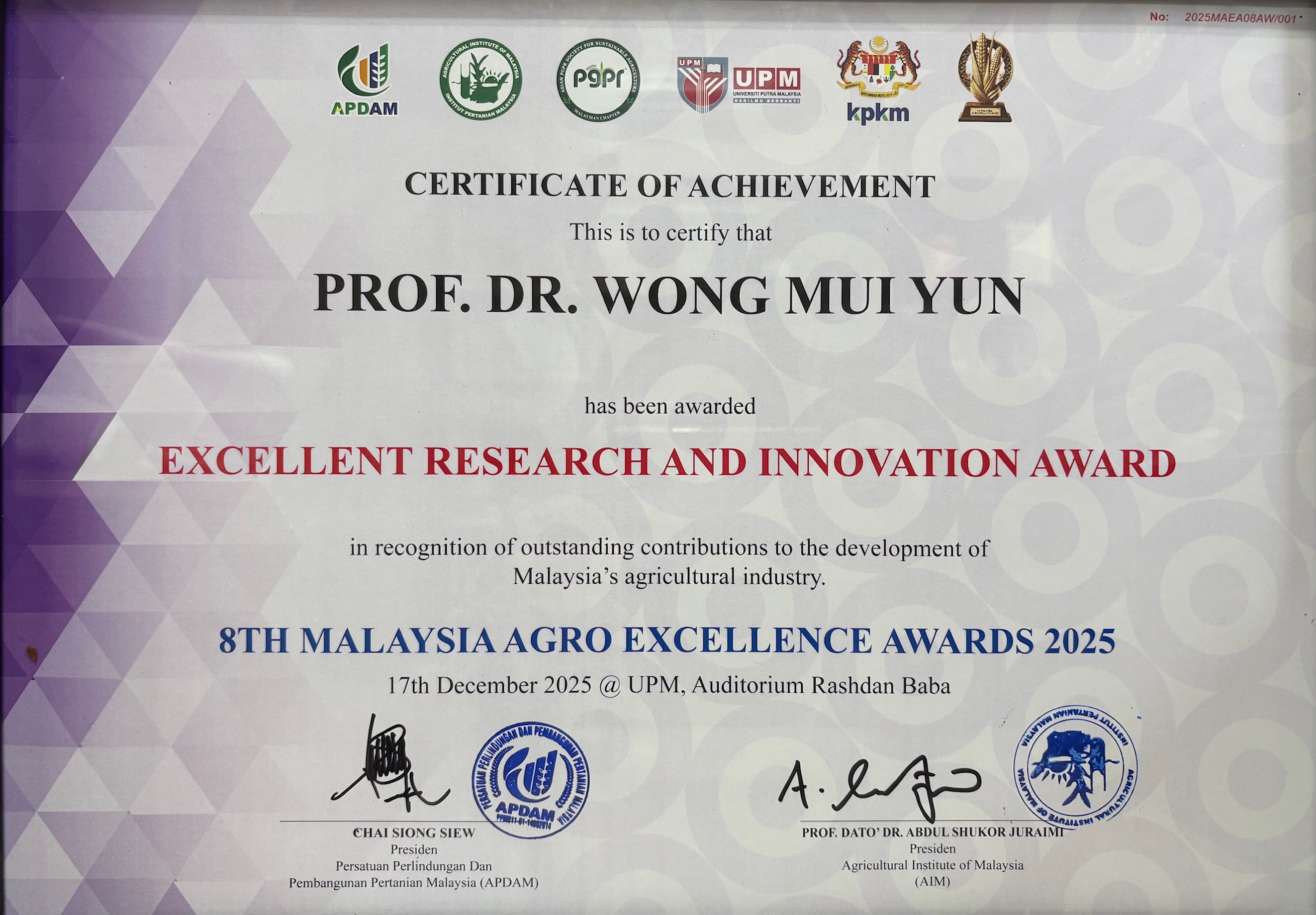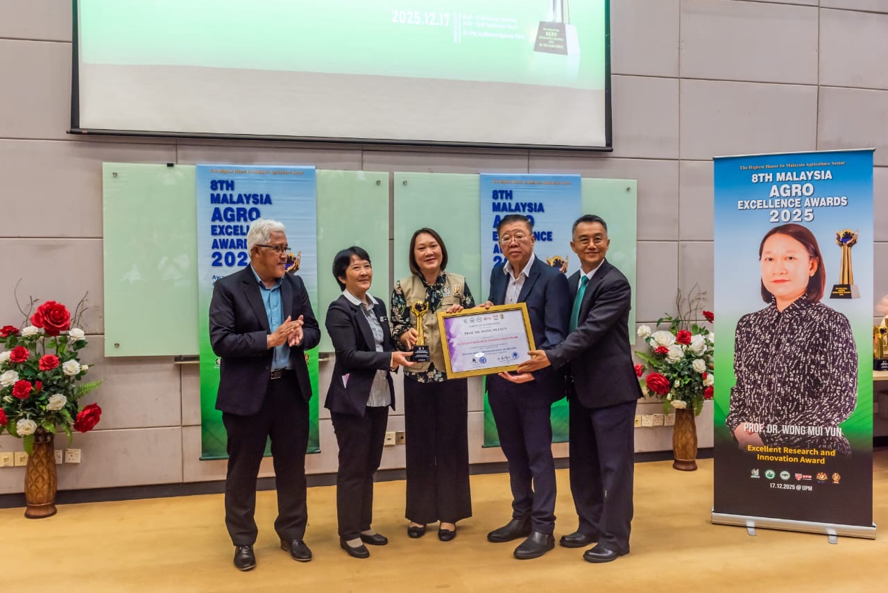 The Deputy Director of IKP, Prof. Dr. Wong Mui Yun, FASc, received the Excellent Research and Innovation Award 2025 from the Agricultural Protection and Development Association of Malaysia (APDAM) during the 8th Malaysia Agro Excellent Awards 2025 (MAEA 2025) Ceremony. The ceremony, themed “Sustainable Agriculture: Smart, Sustainable and Secure,” was held on 17 December 2025 from 9.30 am to 12.30 pm at the Auditorium Rashdan Baba, TNCPI Office Building. Prof. Dr. Wong was one of seven recipients recognised for outstanding contributions in various agriculture-related fields. In addition to the award, Prof. Dr. Wong was invited as a distinguished speaker at the MAEA Forum 2025, where she delivered a talk entitled “Sustainable Crop Protection,” highlighting innovative approaches towards strengthening sustainable agricultural practices. |