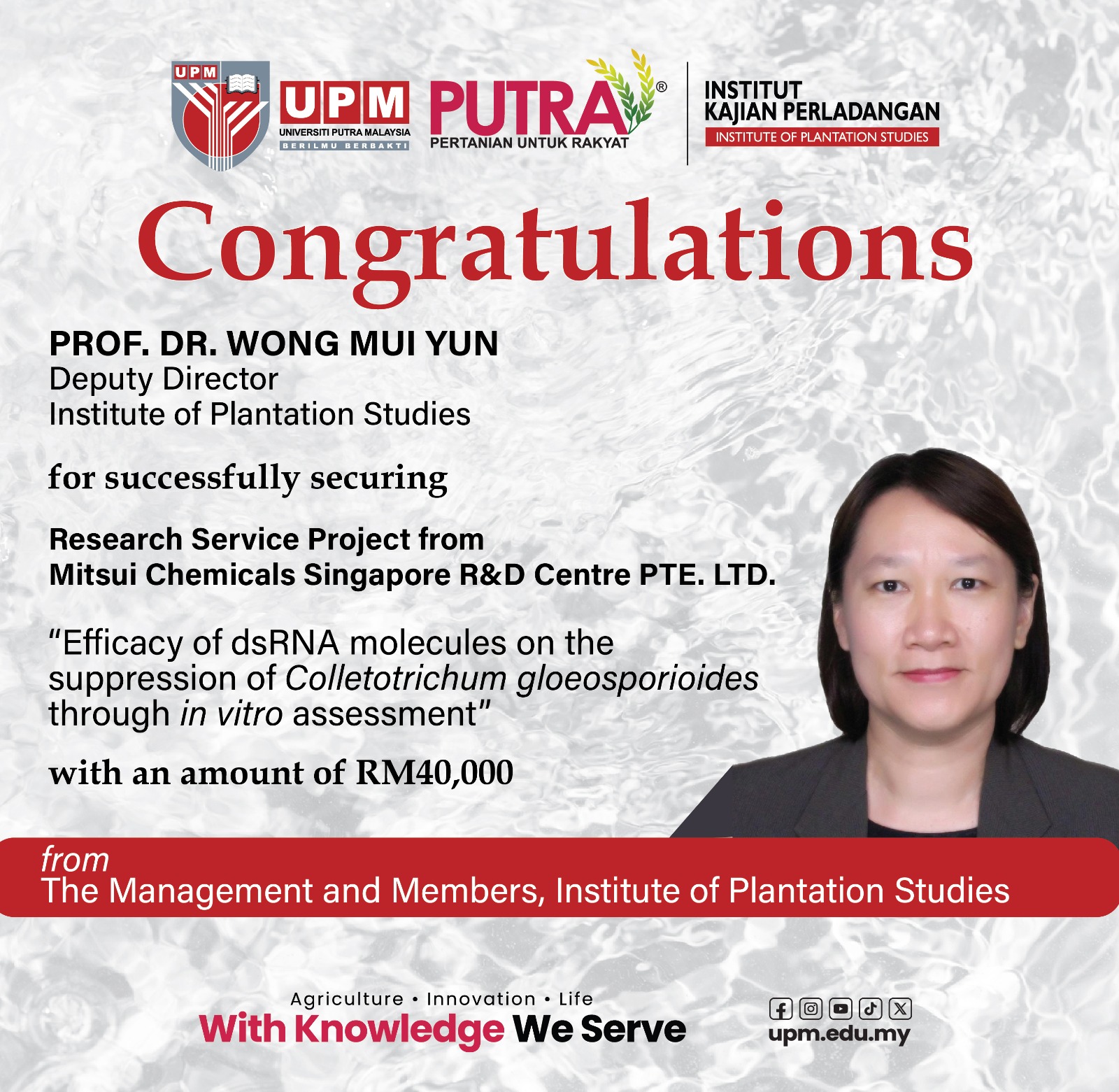 SERDANG, 29 December 2025 – The Institute of Plantation Studies (IKP), Universiti Putra Malaysia (UPM), has been awarded a research grant worth RM40,000 from Mitsui Chemicals Singapore R&D Centre PTE. LTD. for a pioneering project entitled “Efficacy of dsRNA Molecules on the Suppression of Colletotrichum gloeosporioides through In Vitro Assessment.”